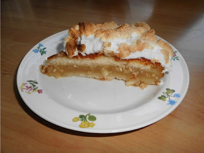 Gör en pajdeg och låt den vila etc. Jag förgräddade den också 5 plus 5 minuter (med och utan aluminium kring kanten) i 180°, men det står inte i receptet. Sedan skär man lagom stora klyftor av äpplen (det står ett kilo, men jag tror det var mindre) och gör ett rutmönster på ryggen (gräddningen går snabbare då) med kniv och lägger dem på botten och gräddar 25 - 30 minuter i 225°. När äpplena är mjuka häller man över smeten.