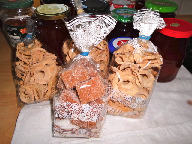 Lufttorkade äppelskivor och en påse kvittenmarmelad framför geléburkar.